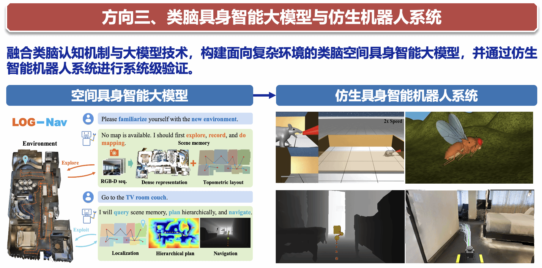 融合类脑认知机制与大模型技术,构建面向复杂环境的具身智能模型,实现感知—记忆—决策—行动一体化。在机器人平台开展系统集成与验证,形成具备自主导航、灵巧操作、高效运动与自然交互能力的仿生机器人系统,支撑复杂环境下的智能制造、服务与农业应用。